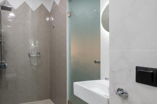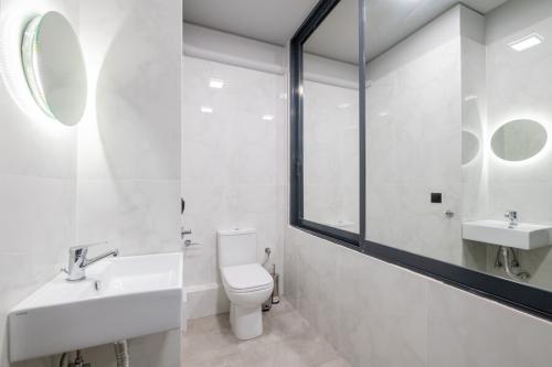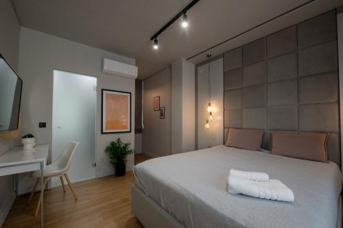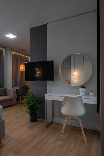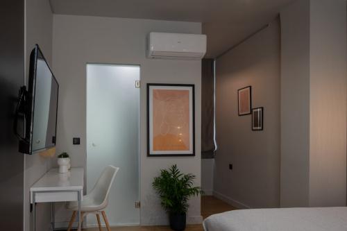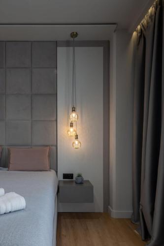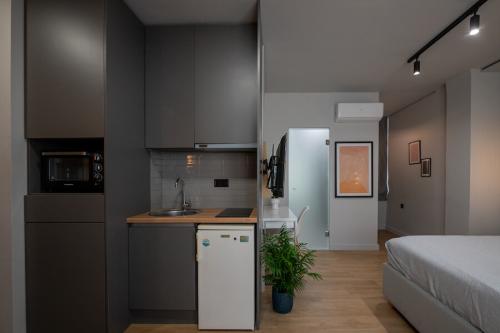 Ο χώρος ανακαινίστηκε πλήρως και πλέον περιλαμβάνει ένα μεγάλο μπάνιο με άνετη ντουζιέρα επενδυμένη με πλακάκια σε μορφή ψαροκόκαλου με ρομβοειδείς απολήξεις στον κάθετο τοίχο, που παραπέμπουν σε στέγες συγκροτήματος κατοικιών. Στο υπόλοιπο μπάνιο τοποθετήθηκε λευκό γυαλιστερό πλακάκι το οποίο συμβάλει στην καθαρότητα και την φωτεινότητα που απαιτούσε ο συγκεκριμένος χώρος. Η γυάλινη πόρτα εισόδου σε αυτό επιλέχθηκε ώστε να παρασύρει το φως από τον υπόλοιπο χώρο εσωτερικά του μπάνιου. Μια μικρή αλλά πλήρης κουζίνα που καλύπτει τις απαιτήσεις των χρηστών, χώρος γραφείου, διθέσιος καναπές και μικρό τραπέζι για 2 άτομα, ντουλάπα η οποία φέρει καθρέφτη στην όψη της, όλα τοποθετημένα άρτια στον ίδιο χώρο στην ίδια χρωματική παλέτα, όπου το κεντρικό θέμα είναι το κρεβάτι. Το επιβλητικό κεφαλάρι του κρεβατιού αποτελείται από ένα κάναβο μαξιλαριών 40 εκ. x 40 εκ. από καπιτονέ ύφασμα σε γκρι απόχρωση και στις δύο πλευρές του στέκονται τα κομοδίνα κάτω από τα κρεμαστά από την οροφή φωτιστικά. Το βινυλικό δάπεδο σε όψη ξύλου πρόσθεσε τη νότα θαλπωρής που αναζητά ο εφήμερος επισκέπτης ενός διαμερίσματος Airbnb.