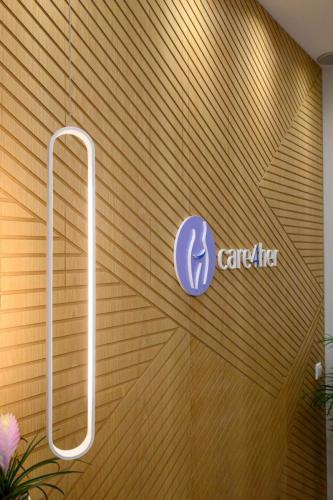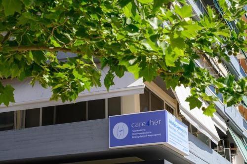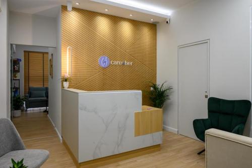 Σχεδιάστηκε στο κέντρο του ιατρείου ένας επιβλητικός χώρος υποδοχής με κυρίαρχο υλικό το πλακάκι–γρανίτη calacatta με ήπια γκρι νερά σε υπόλευκο φόντο, σε συνδυασμό με ξύλο σε φυσική απόχρωση δρυός. Ο χειροποίητος ξύλινος τοίχος ύψους 2,60 μέτρων με γραμμικές διαγώνιες εγκοπές, στο φόντο της reception φιλοξενεί το logo του ιατρείου – care4her – αποτυπώνοντας εκεί την επιτυχημένη φιλοσοφία του πελάτη μας κ. Δέρπαπα Αλέξανδρου για την κάθε ασθενή του.