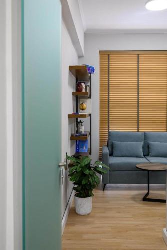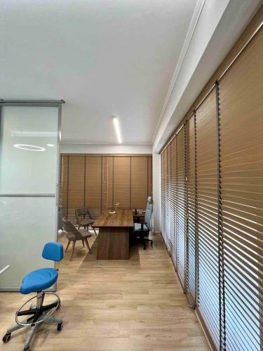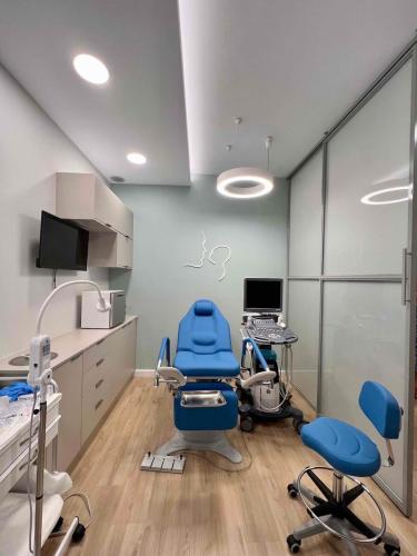 Ο χώρος του ιατρείου είναι ενιαίος με το εξεταστήριο αλλά με μια μεταλλική επάλληλη συρόμενη κατασκευή με γυαλί αμμοβολής που επιτρέπει το διαχωρισμό τους για την παροχή ιδιωτικότητας στην ασθενή κατά τη διάρκεια της εξέτασης. Τα ξύλινα στόρια σε φυσική απόχρωση δρυός που τοποθετήθηκαν εσωτερικά των επάλληλων συρόμενων κουφωμάτων, επιτυγχάνουν, χωρίς την αλλοίωση της εξωτερικής όψης του κτιρίου, τη ρύθμιση του φυσικού φωτός για τις ανάγκες ορισμένων ιατρικών εξετάσεωνεντός του εξεταστηρίου και διαμορφώνουν παράλληλα μια θερμή οπτικά εσωτερική όψη.